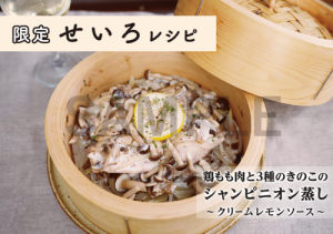 掲載レシピ:「鶏もも肉と3種のきのこのシャンピニオン蒸し~クリームレモンソース~」