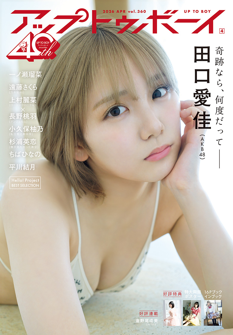 セブンネット限定表紙には、AKB48の最新シングル『名残り桜』に選抜入りを果たした田口愛佳が最新撮り下ろしで登場! 新年一発目を飾る今回は、彼女のペンライトカラーであり、紅白のめでたさも感じる赤と白をキーカラーとしたグラビアに。さらに注目なのが、超レアな金髪姿! キュートかつハンサムな彼女の魅力をぜひ誌面でチェックしてください!